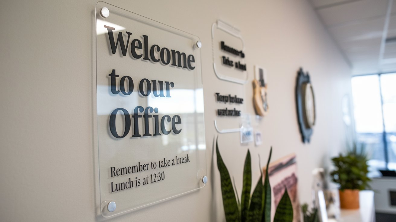Signboard yang diperbuat daripada bahan akrilik jernih atau berwarna, memberikan penampilan yang moden dan elegan. Akrilik tahan lasak dan boleh dicetak atau dipasang dengan huruf untuk menampilkan logo atau nama perniagaan, sesuai untuk ruang dalam atau luar.